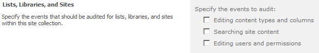In the Documents and Items section the several different options are available to turn on/off the auditing of: